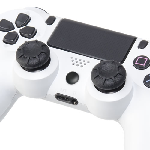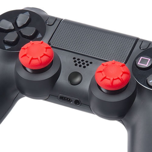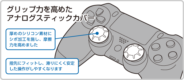 PS4用コントローラーのアナログスティックの操作性を向上させるカバーです。厚みのあるシリコン素材にシボ加工を施し、摩擦力を高めました。カバー表面の放射線状のデザインが指を置いたときにしっかりとフィットし、滑りにくく、アクションゲームやFPSなどの細かな操作もラクラク行えます。
