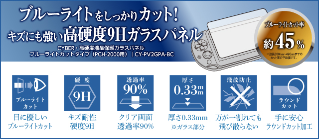 PS Vita(PCH-2000)の液晶画面を徹底保護、高硬度&高透明の薄型ガラスパネル! 目にやさしいブルーライトカットタイプ
