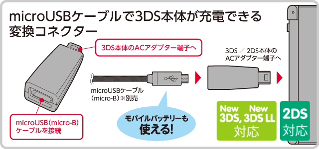 Android端末やPS Vita(PCH-2000)などに採用されているmicroUSB-Bの端子を3DSの端子に変換できるコネクターです。本製品を使えばmicroUSB用と3DS用、それぞれのACアダプターでコンセントを塞がなくて済み、省スペースで複数の機器を充電することができます。New3DS/New3DS LL/3DS/3DS LLはもちろん、2DSでも使用できます。
