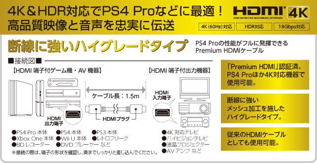 4Kテレビで60FPS映像出力が可能なPS4 Proの映像を、高品質のままテレビに伝送するためにはHDMIの最新規格Premium HDMIの認証に合格したケーブルが必要となります。PS4 Proの性能をフルに発揮させる、断線に強いメッシュタイプのハイグレードなPremium HDMIケーブルです。