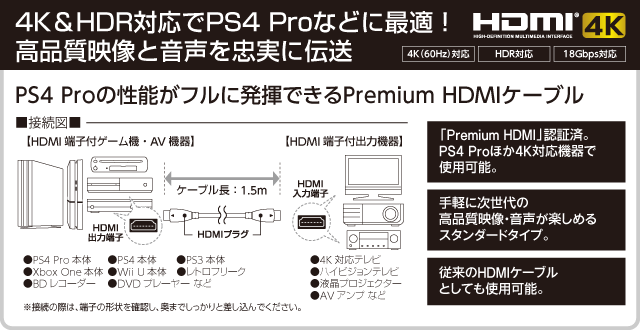 4Kテレビで60FPS映像出力が可能なPS4 Proの映像を、高品質のままテレビに伝送するためにはHDMIの最新規格Premium HDMIの認証に合格したケーブルが必要となります。PS4 Proの性能をフルに発揮させる、お手頃価格Premium HDMIケーブルです。