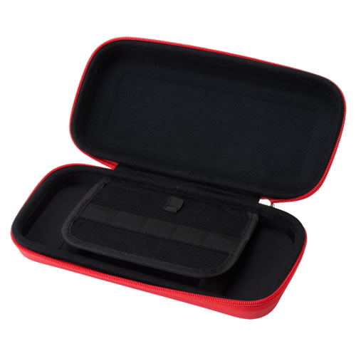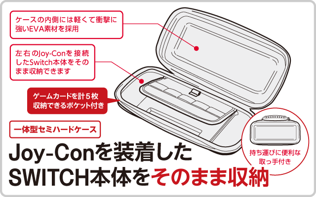左右のJoy-Conを接続したままのSwitch本体を収納できるセミハードケースです。収納したNintendo Switchの液晶画面を保護するフラップ付き。フラップにはSwitch用ゲームカードを計5枚収納できるポケットがついています。