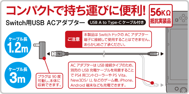 USB接続タイプのコンパクトなACアダプターと、Nintendo Switch用充電ケーブルのセットです。ケーブルは持ち運びにも便利な約1.2mと、電源から離れた場所でもゆったりと使える約3mの2製品をご用意。ご利用環境に合わせて選べます。