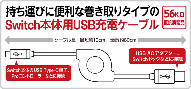 巻き取り式で持ち運びに便利なNintendo Switch用USB充電ケーブル