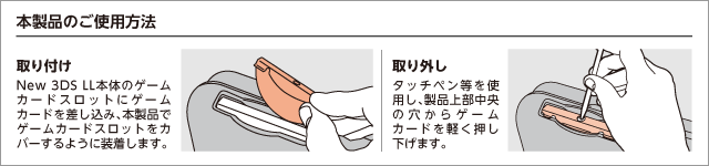 New 3DS LL、3DS、3DS LL本体にセットしたゲームカードにかぶせるようにプッシュガードを挿入するだけで簡単に取り付け! New 3DS LL本体および、3DS/3DS LL本体のゲームカードスロットにぴったりと収まります。