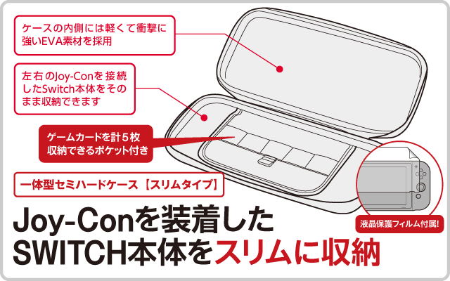 左右のJoy-Conを接続したままのSwitch本体を収納できるセミハードケースです。薄型でコンパクトに収納できます。収納したNintendo Switchの液晶画面を保護するフラップ付き。フラップにはSwitch用ゲームカードを計5枚収納できるポケットがついています。