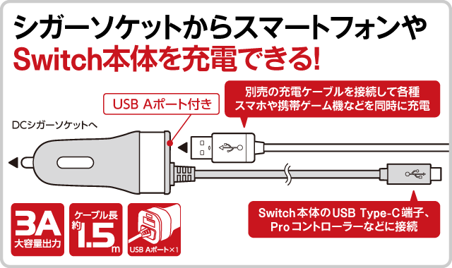 車のシガーソケットからNintendo Switch本体を充電できるカーチャージャーです。ケーブル長は車内で使うには十分な1.5m、後部座席にも届きます。さらに、汎用性の高いUSB Aポートを搭載しており、各種USB充電ケーブルを繋ぐだけでNew 3DS/New 3DS LL/2DS/New 2DS LL/PS Vitaなどのゲーム機や、スマートフォンなども充電できます。