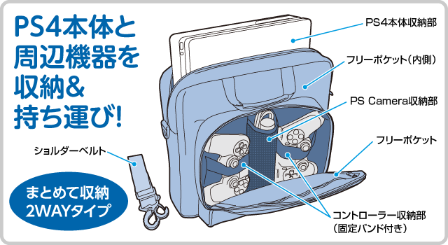 PS4本体と周辺機器をまとめて収納&持ち運びできるキャリングバッグです。PS4本体のほか、コントローラー2個とPS Camera(※)を収納でき、さらにフリーポケットにケーブル類などの小物も収納できます。また、ショルダーベルトは長さの調節や取り外しが可能。短めにして肩掛けにしたり、伸ばして斜め掛けにしたり、取り外して取っ手を持つなど、好みのスタイルで使用できます。