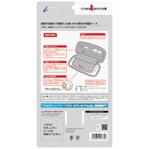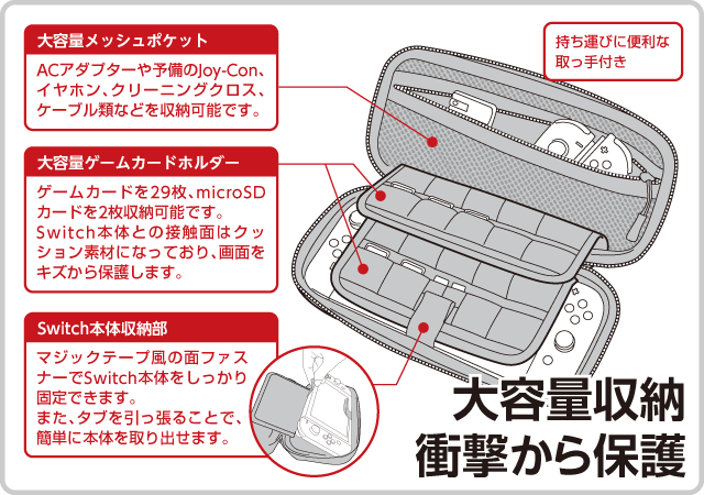 左右のJoy-Conを接続したままのSwitch本体を収納&持ち運びできるキャリングケースです。内部にはSwitch用ゲームカード29枚とmicroSDカード2枚を個別に収納できるポケット付き。大容量のメッシュポケットが付いており、かさばりがちな純正のACアダプターをはじめ、予備のJoy-Con、Joy-Conストラップ、イヤホンなどの関連アイテムをまとめてすっきりと収納できます。ファスナー部にはSwitch本体をイメージした赤と白のライン入り。