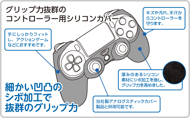 PS4用コントローラーをキズや汚れから守り、グリップ力を向上させるシリコンカバーです。厚みのあるシリコン素材に細かいシボ加工を施してあるため、グリップ力抜群。ハンティングアクションやFPSなど、高いアクション性を求められるゲームのプレイに適しています。