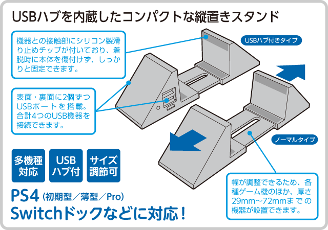 幅が調節でき、薄型PS4とPS4 Proのどちらにも使用可能。その他にも、Nintendo SwitchドックやPS VR用プロセッサーユニットなど、さまざまな機器で使用できます。