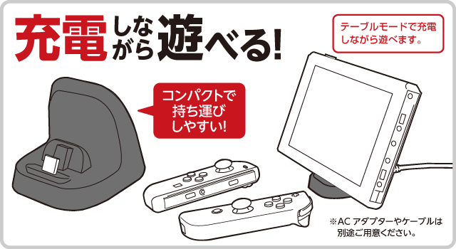- ※本製品で充電する際は、別途純正のNintendo Switch ACアダプターまたは弊社製のSwitch用充電ケーブルが必要です。