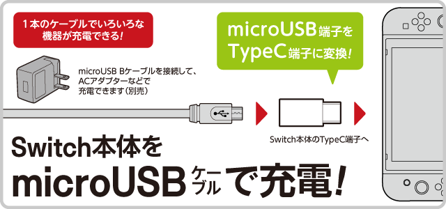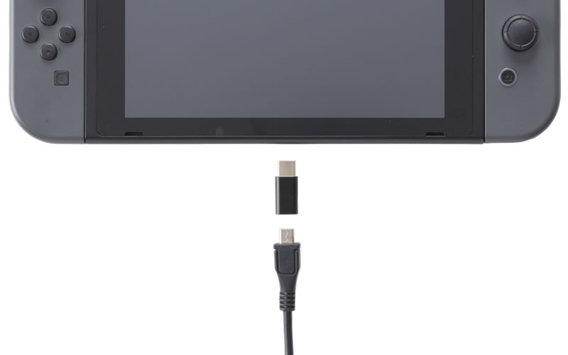 PS4用コントローラーやPS Vita (PCH-2000)、Android端末やなどに採用されているmicroUSB B端子を、Nintendo Switch本体に採用されているUSB TypeC端子に変換できるコネクターです。本製品を使えばmicroUSB機器用とSwitch用、それぞれのACアダプターでコンセントをふさがなくて済み、省スペースで様々な機器を充電することができます。また、Switch本体に弊社製のシリコンカバーやプロテクトカバーなどを着けたままでも使用可能です。