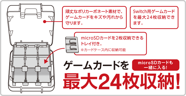 Nintendo Switch用ゲームカードケースです。最大24枚のゲームカードを、まとめてコンパクトに収納&持ち運びできます