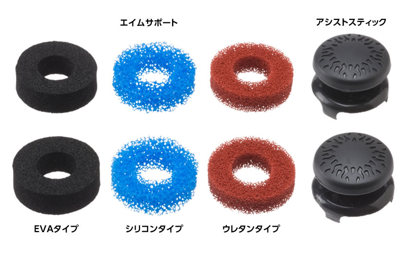 エイムサポートをL/Rスティックに干渉させることで倒し過ぎを防ぎ、微妙な力加減が調整しやすくなります。しっかりとした抵抗感のある「EVAタイプ」、適度な反発弾性がある「シリコンタイプ」、やわらかな「ウレタンタイプ」の3種類を2個ずつセットにしました。それぞれ操作感が異なるため、お好みの操作感のものを選んで使えます。