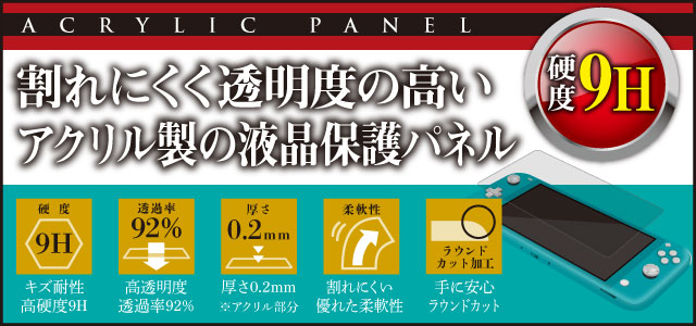 硬度9H(※1)のアクリル素材を採用。透過率92%、ヘイズ2%(※2)以下で、ガラスに近い透明度を持ちながらガラスよりも割れにくく、Switch Liteの液晶画面を徹底的に保護します。