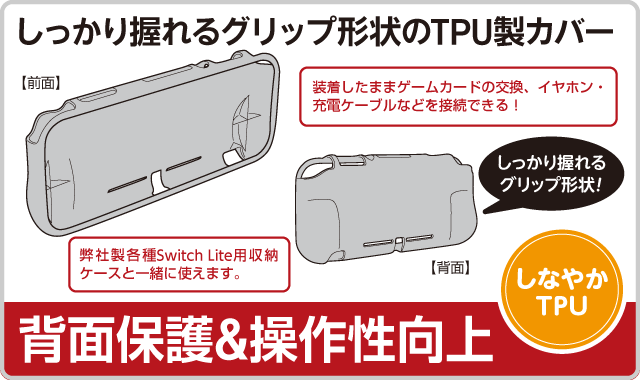 ゴムのような弾力性と硬質プラスチックのような強靭さを合わせ持つTPU(熱可塑性ポリウレタン)を採用したSwitch Lite用本体保護カバーです。本体へ簡単に装着が可能で、衝撃を吸収し、キズや汚れからしっかりと保護します。本製品を装着したまま、別売の弊社製各種Switch Lite用ケースに収納できます。