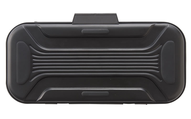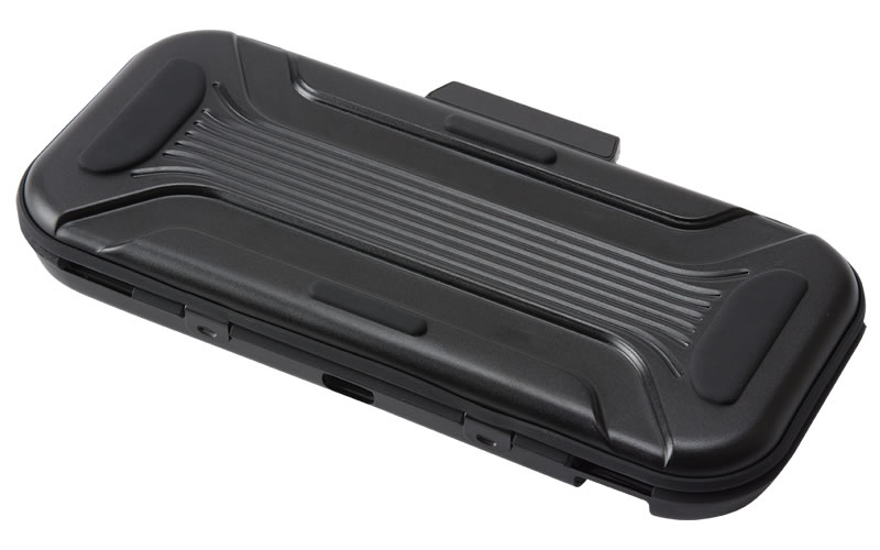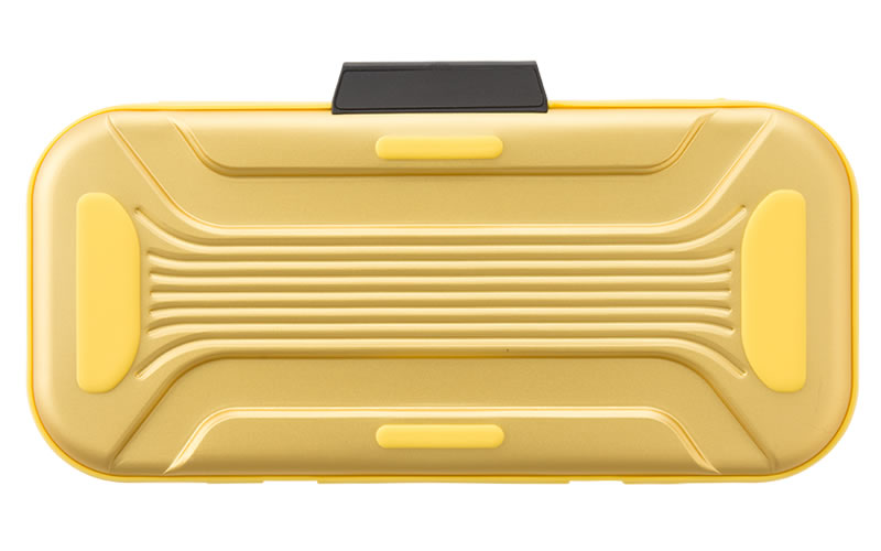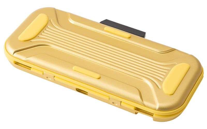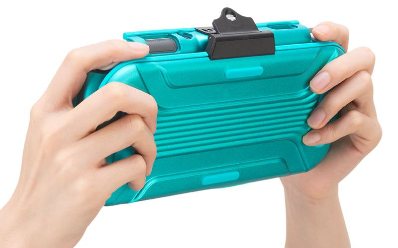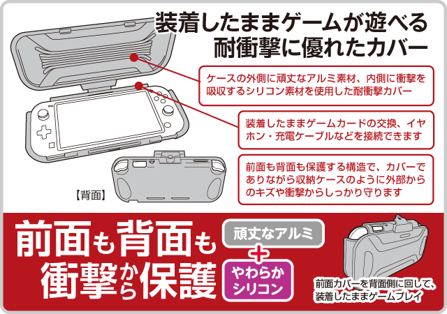 頑丈なアルミ素材と衝撃を吸収するシリコン素材を使用した耐衝撃カバーです。前面開閉式のため、収納時には前面側もしっかり保護できます。カバー上部に回転式の留め具が付いており、ゲームプレイ時は前面カバーを背面側に回して操作できるため、操作時に邪魔になりません。