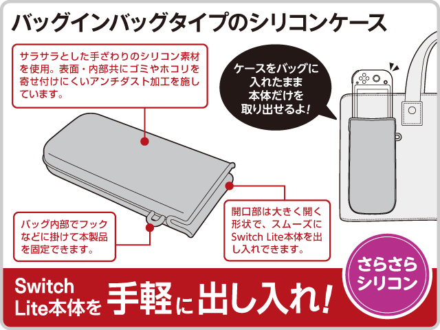 素材はやわらかなシリコンを採用。Switch Lite本体をバッグ内でのキズや汚れから守り、安心して持ち運びできます。サラサラとしたアンチダスト加工がケースの内側にも施され、開口部は大きく開く形状になっているため、Switch Lite本体の出し入れがスムーズに行えます。