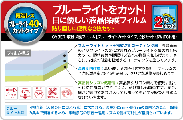ブルーライトを最大約40%カットして、目の健康を守るNintendo Switch用液晶保護フィルム