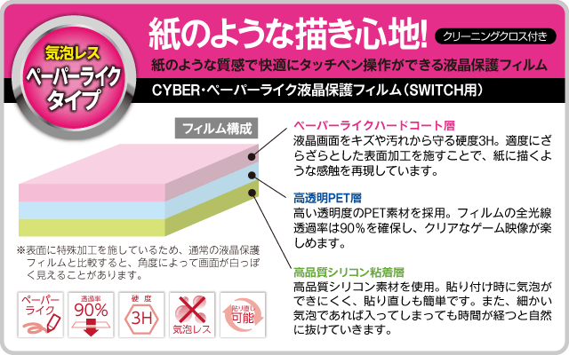表面に凹凸のあるざらざらとした特殊加工を施し、紙に描くような質感を再現したSwitch用液晶保護フィルムです。表面がつるつるとした従来の液晶保護フィルムと異なり、しっかりとした描き心地で、『スーパーマリオメーカー2』や『脳を鍛える大人のNintendo Switchトレーニング』などタッチペンを頻繁に使用するゲームにおすすめです。