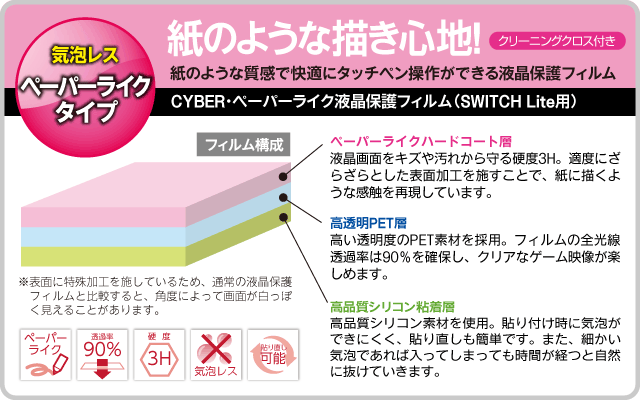 表面に凹凸のあるざらざらとした特殊加工を施し、紙に描くような質感を再現したSwitch Lite用液晶保護フィルムです。表面がつるつるとした従来の液晶保護フィルムと異なり、しっかりとした描き心地で、『スーパーマリオメーカー2』や『脳を鍛える大人のNintendo Switchトレーニング』などタッチペンを頻繁に使用するゲームにおすすめです。