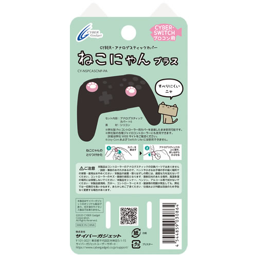 - ※本製品はProコントローラー用です。Joy-Conおよびその他の機器には使用できません。Joy-Con用、Nintendo Switch Lite用は、別売の『CYBER・アナログスティックカバー ねこにゃん プラス(SWITCH Joy-Con/SWITCH Lite用)』『CYBER・アナログスティックカバー ねこにゃん(Switch Joy- Con用)』をお求めください。