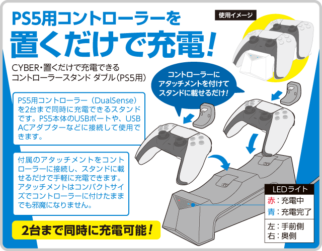 使用イメージ:CYBER・置くだけで充電できるコントローラースタンド ダブル(PS5用)〈ブラック〉