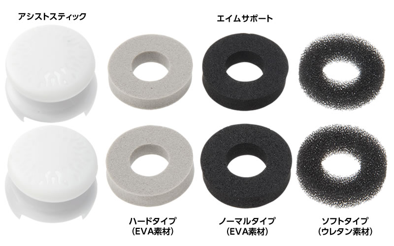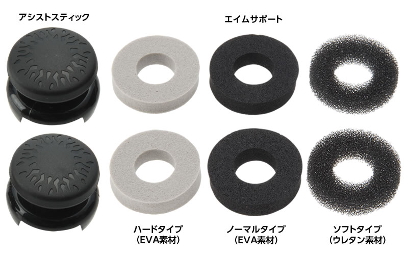 セット内容:エイムサポート×6(ハードタイプ×2、ノーマルタイプ×2、ソフトタイプ×2)、アナログアシストスティック×2