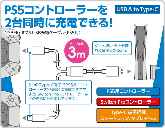 ケーブル長はロングタイプの3m(ストレート部:1m/分岐部:各2m)。また、Switch ProコントローラーやType-C端子搭載のスマートフォン、タブレット端末なども充電できます。