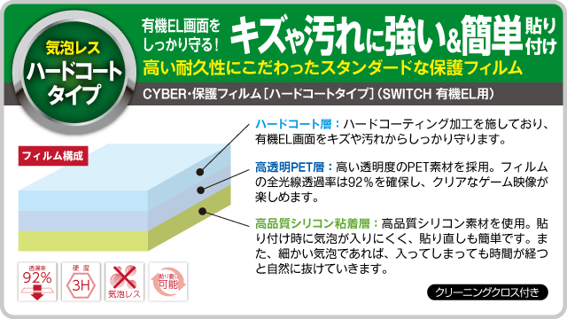 キズや汚れに強いハードコートタイプ、高い耐久性にこだわったスタンダードな保護フィルムです。Nintendo Switch(有機ELモデル)の画面をしっかりと守ります。