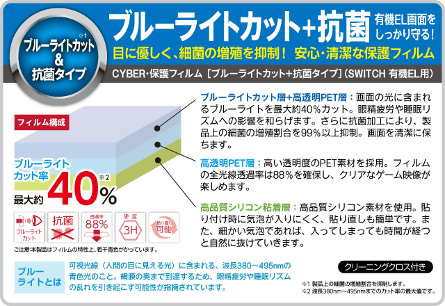 ![]() CYBER・保護フィルム [ブルーライトカット+抗菌タイプ] (SWITCH 有機EL用) |