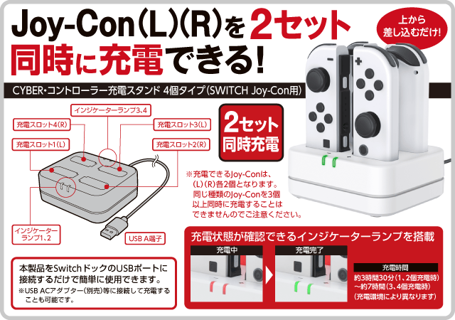 - ※充電できるJoy-Conは(L)(R)各2個です。Joy-Con(L)だけを4個、Joy-Con(R)だけを4個など同じ種類のJoy-Conを3個以上同時に充電することはできません。