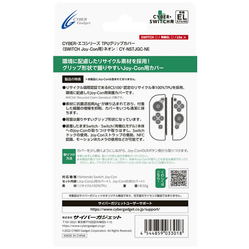 リサイクル国際認証であるRCS100(※)認定のリサイクル100%TPUを使用した、環境配慮設計型のJoy-Con用グリップカバーです。ゴムのような弾力性と硬質プラスチックのような強靭さを合わせ持つTPU素材が、Joy-Conをキズや汚れからしっかりと保護。カバー背面には膨らみを設けており、握った際にグリップ力を向上させます。製品パッケージも、環境にやさしい紙製のパッケージを採用しました。
