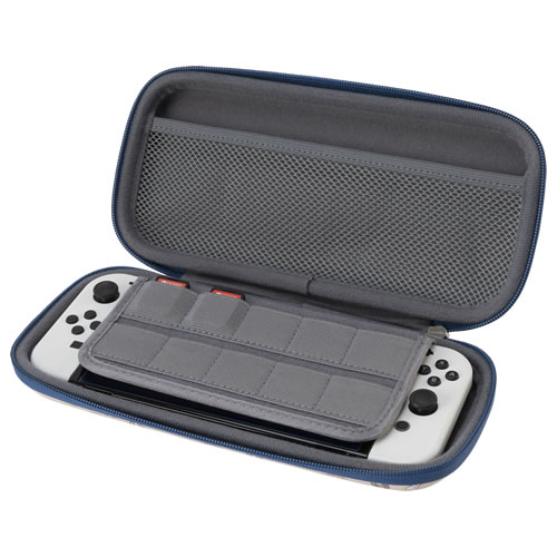 ポーチ内部にはイヤホンやクリーニングクロスなどのアクセサリーを収納できるメッシュポケットと、Switch用ゲームカードを10枚収納できるポケットが付いており、本体と関連アイテムをまとめて収納&持ち運びできます。