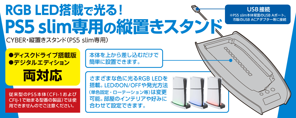 - ※本製品は2023年11月に発売された小型化モデルのPS5 slim本体(CFI-2000A01/CFI-2000B01)専用です。従来型のPS5本体(CFI-1およびCFIJ-1で始まる型番の製品)、PS5 Pro本体では使用できませんのでご注意ください。