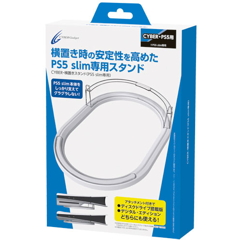 PS5 slim専用の横置きスタンドです。スタイリッシュなデザインで、PS5 slim本体付属の「横置き用フット」と比べて安定性が高いため、安心してPS5 slim本体を設置できます。付属のアタッチメントを付け替えることで、ディスクドライブ搭載版(通常版)とデジタル・エディション、どちらのモデルにもご使用いただけます。