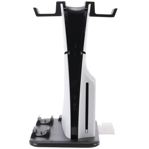 PS5 slim本体と、コントローラー2台、ヘッドセット2台、ゲームソフト6本をまとめて設置できるスタンドです。アタッチメント付きで、PS5 slim本体のディスクドライブ搭載版(通常版)とデジタル・エディションの両方に対応。付属のネジで本体をしっかりと固定できるため、縦置きの状態でも安定して設置できます。