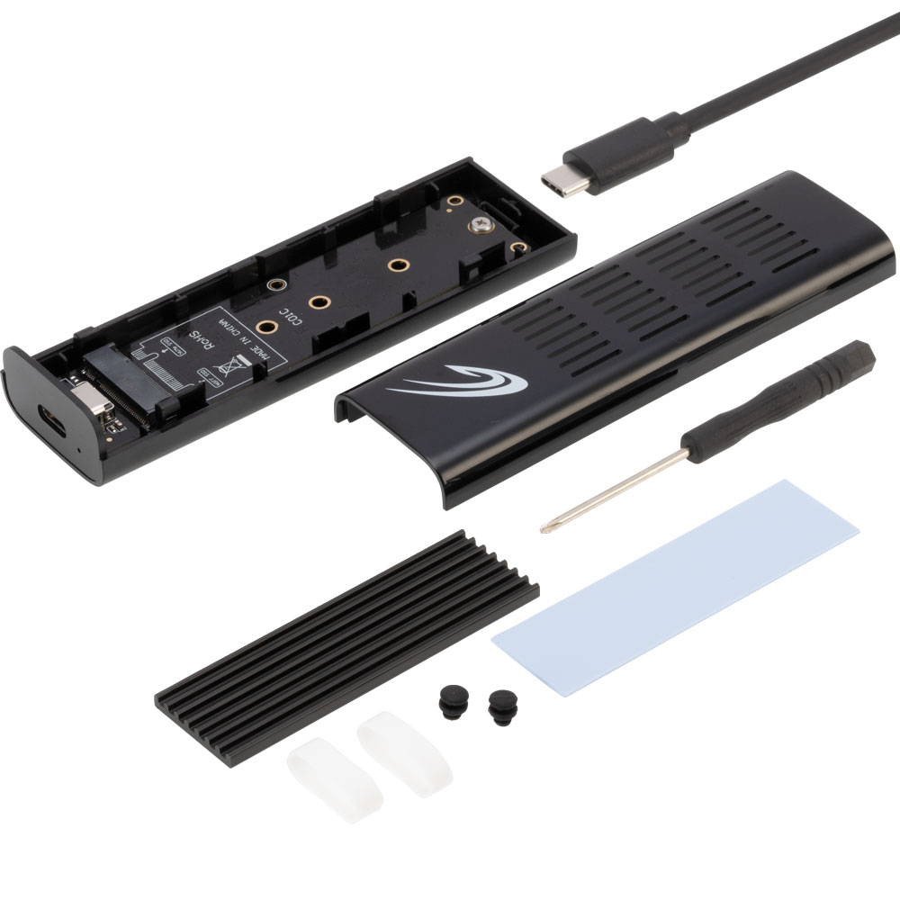 ヒートシンク搭載型と非搭載型のM.2 SSDの両方に対応。非搭載型を使用する場合も、付属の冷却用サーマルパッドとアルミ製放熱プレートを通じて、効果的に放熱が可能です。