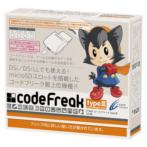 パラメーターMAXやレアアイテムゲットなど、ゲーム攻略に役立つさまざまな秘技が使える「コードフリーク」に、DSi/DSi LL/3DS/3DS LL対応の『コードフリーク typeIII(DS用)』が登場!