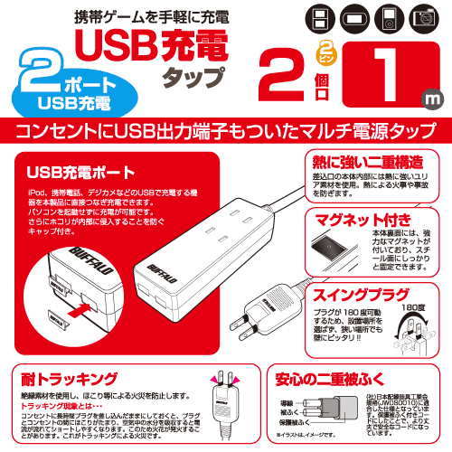 最近ではDSやPSP、iPhone、携帯電話など、USBケーブルを使用して充電する機器が多くなりました。本製品はOAタップの前面にUSBタイプのACアダプタ機能を搭載。PS3やWiiなどの据え置き型ゲーム機をコンセントに挿したままで、iPhoneやDSなどの携帯機器をUSB端子で充電することができます。