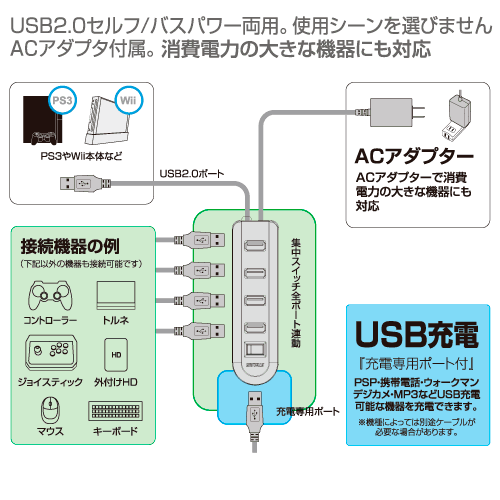 本製品はセルフパワー、バスパワーの両方に対応しているため、使用シーンを選びません。キーボードやコントローラなど、使用電力の小さな機器を使用する際はバスパワー接続で、外付けハードディスクなど使用電力の大きな機器を使用する際にはセルフパワーでお使いいただけます。また、待機時の使用電力を抑えるために、省エネ・節電スイッチも搭載しました。