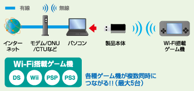 DS/3DS/PSP/Wii/PS3などの各種ゲーム機を、無線でインターネット接続できるWi-Fiコネクターです。