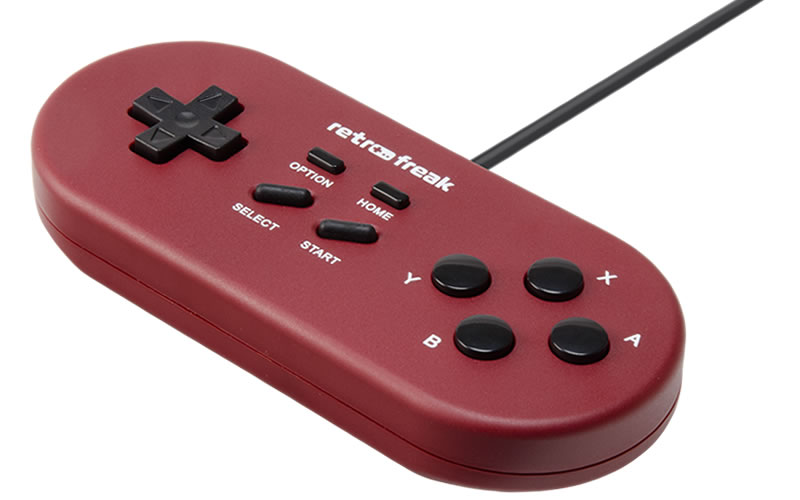 レトロフリークおよびレトロフリーク ベーシック(SFC用)スタンダードセットには、USB接続の有線コントローラーが1つ付属しています。レトロゲームのプレイに適したコントローラーで、専用のボタンも備えています。