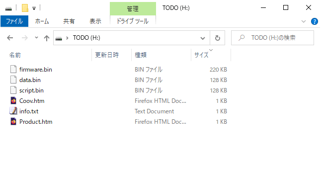 - ※「TODO」外部ドライブ内には既に「firmware.bin」ファイルが存在します。解凍したファイルとドライブ内の「firmware.bin」ではファイルサイズが大きく異なりますが、そのまま上書きをして問題ありません。