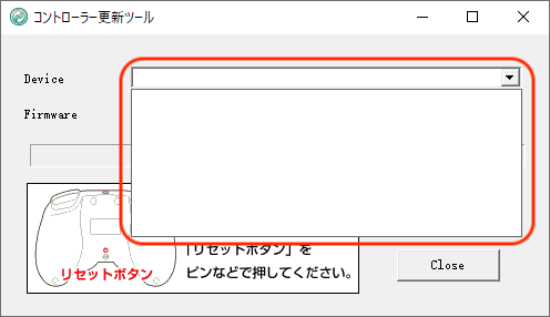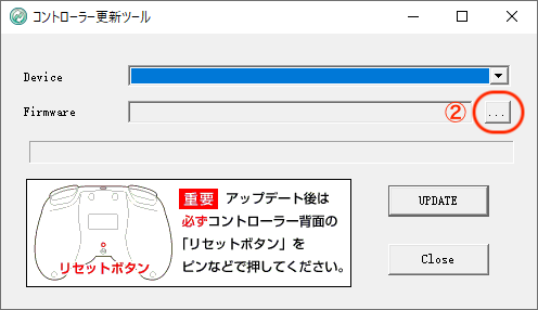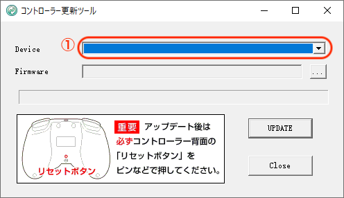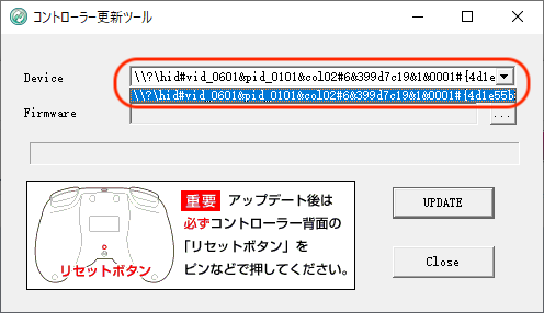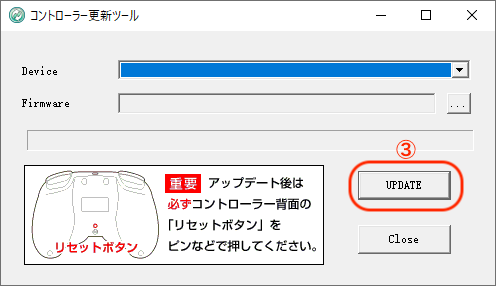 重要:アップデート後は必ずコントローラー背面の「リセットボタン」をピンなどで押してください。 「リセットボタン」を押さないとコントローラーが使用できません。