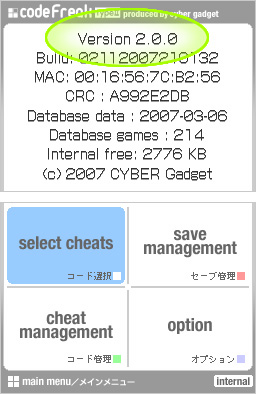 - ※コードフリークのバージョンは、メインメニューでSELECTボタンを押すと表示されるインフォメーションの1行目で確認することができます。
