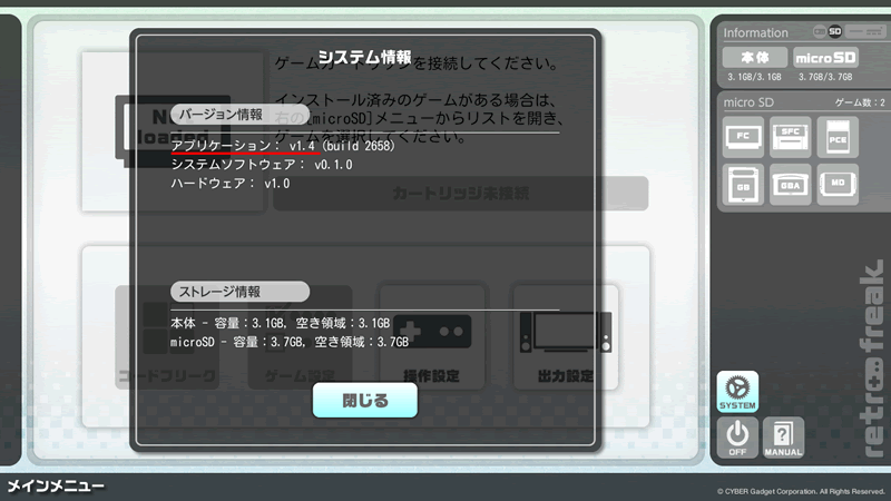 現在のレトロフリーク最新バージョンは【バージョン2.7】です。レトロフリークのアップデート方法をご覧ください。
